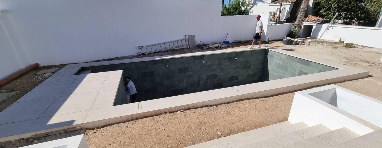Ejecución de obra para construcción, modificación y reparación de piscinas en viviendas unifamiliares y urbanizaciones. Imágenes de obras recientes de piscina en vivienda unifamiliar aislada con sistema de plataforma elevable (Elviria, Málaga). Modificación y reparación de piscina en urbanización (Marbella, Málaga)